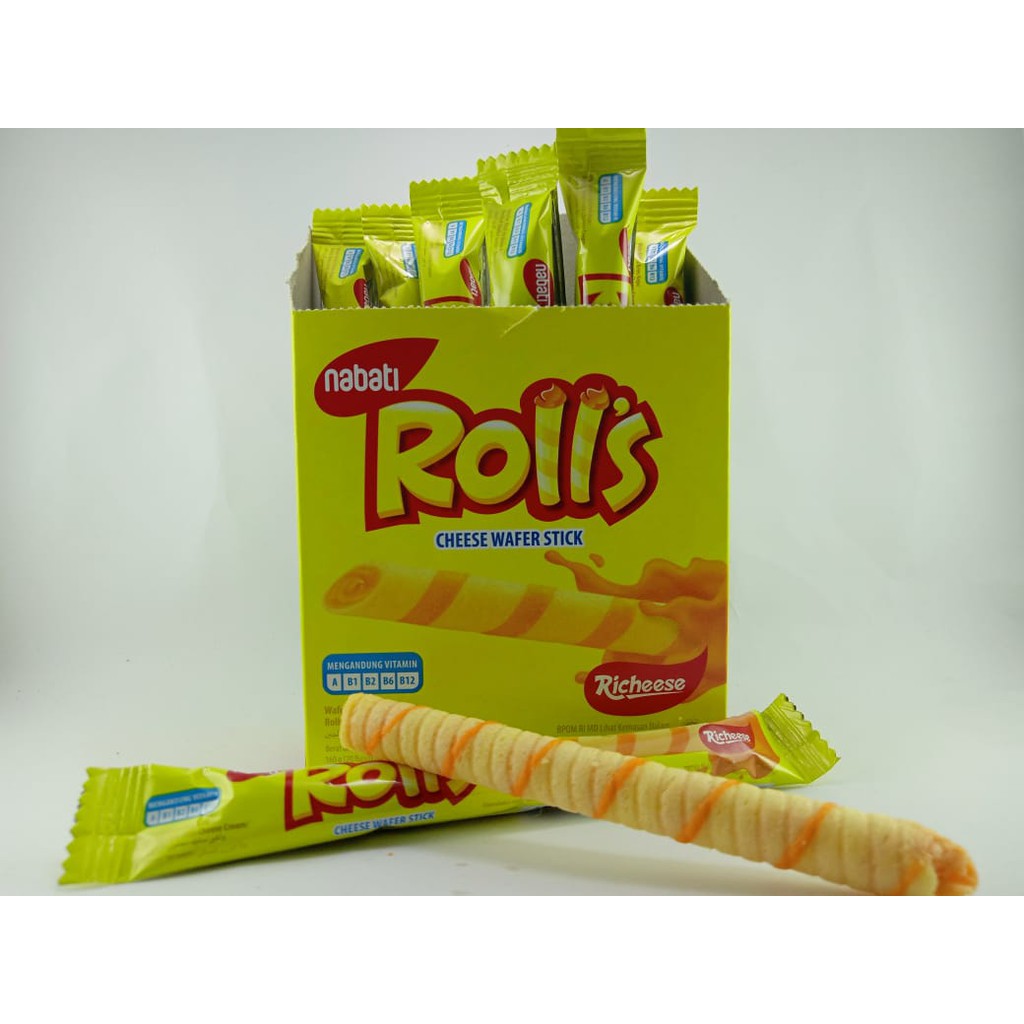 Rolls adalah wafer stick dengan perpaduan antara krepes yang renyah dengan isi krim berlimpah yang lezat dengan pilihan varian rasa cokelat, hazelnut, dan keju. .keju ala richeese versi ekonomis, pakai kej. Harga richeese nabati rolls coklat /keju isi 20pc/kotak. Sesuai dengan nama produknya, wafer recheese nabati memiliki rasa keju yang sangat gurih dan renyah di mulut. Rolls juga mengandung vitamin a, b1, b2, b6, b12 sehingga merupakan cemilan yang sehat untukmu.